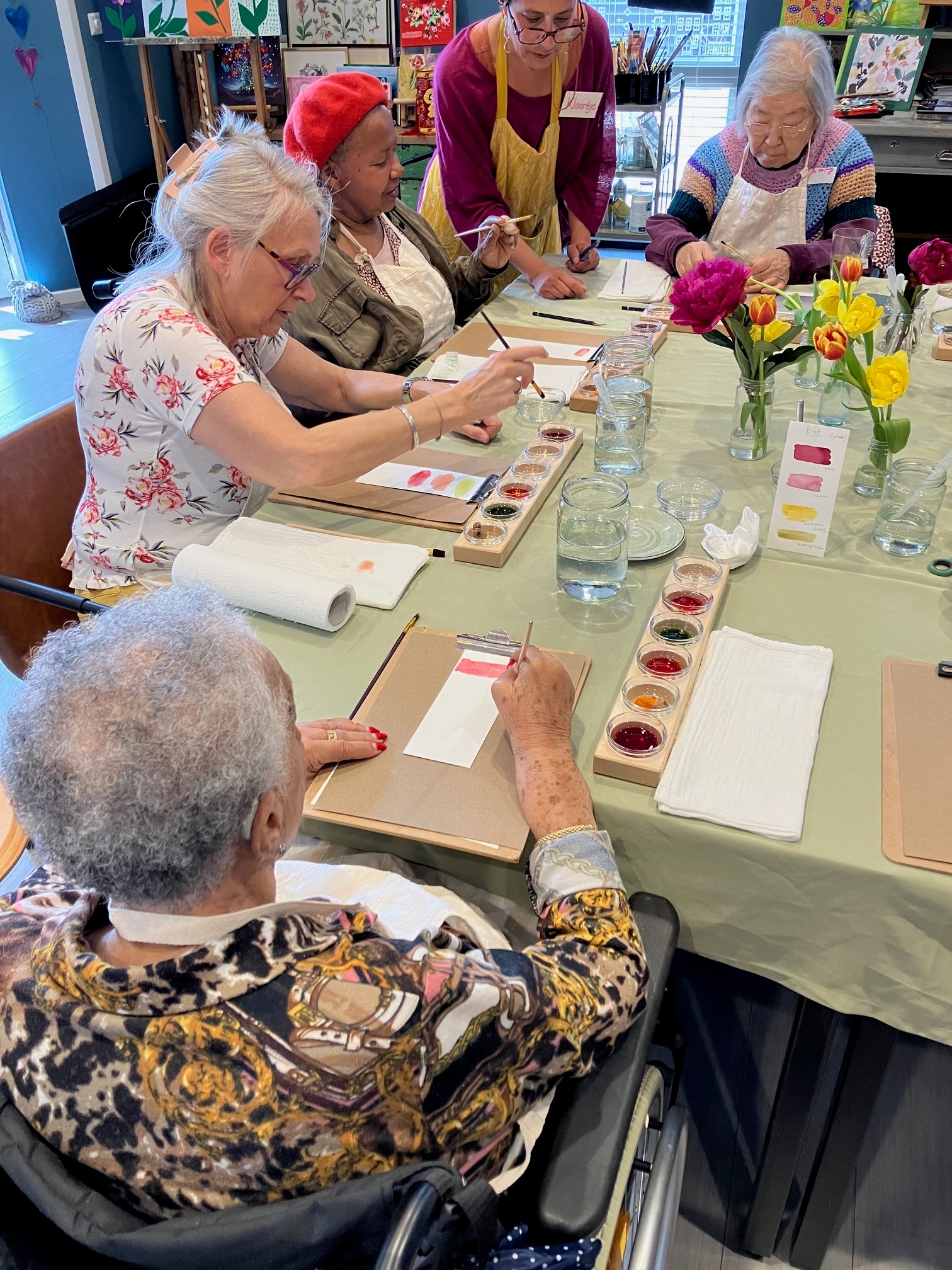 Daarna ging men, geïnspireerd door werk van getoonde kunstenaars, aan de slag met de zelfgemaakte verf. Dit leverde een mooie concentratie op, waarna de leukste werkjes ontstonden.